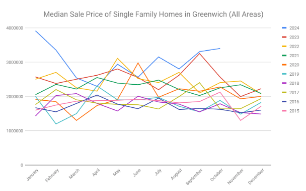 There were 34 single-family residential closings reported across all areas of Greenwich during the month of October 2024. This was a decrease, compared to October 2023 when there were 38 closings.