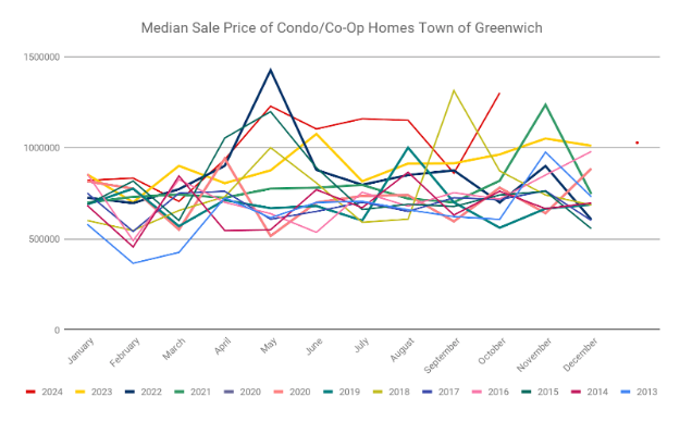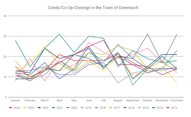 There were 13 condo/co-op residential closings reported across all areas of Greenwich during the month of October 2024. This was an increase, compared to October 2023 when there were 12 closings.