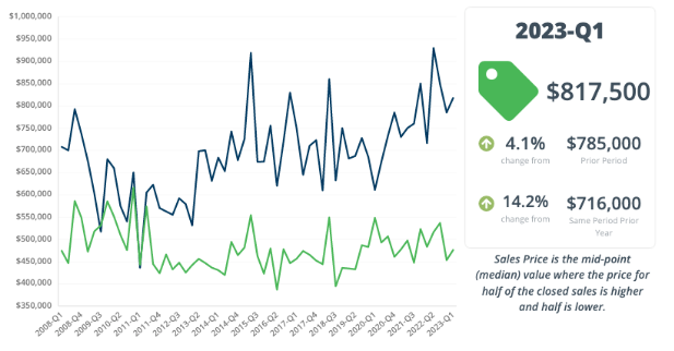 The median sale price for a condo/co-op increased to $817,500 from the median sales price in Q1 2022, which was $716,000.