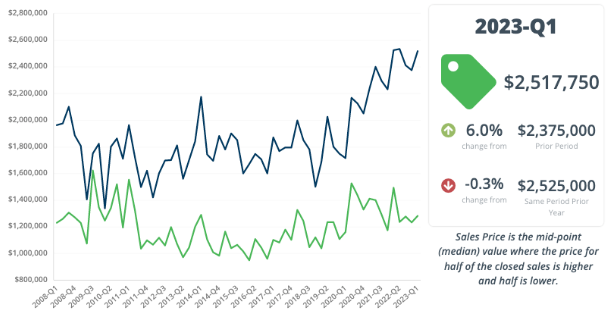 The number of single-family residential closings decreased compared to Q1 2022 when there were 142 closings. The median sale price for a single-family home decreased to $2,517,750 from the median sales price in Q1 2022, which was $2,525,000.
