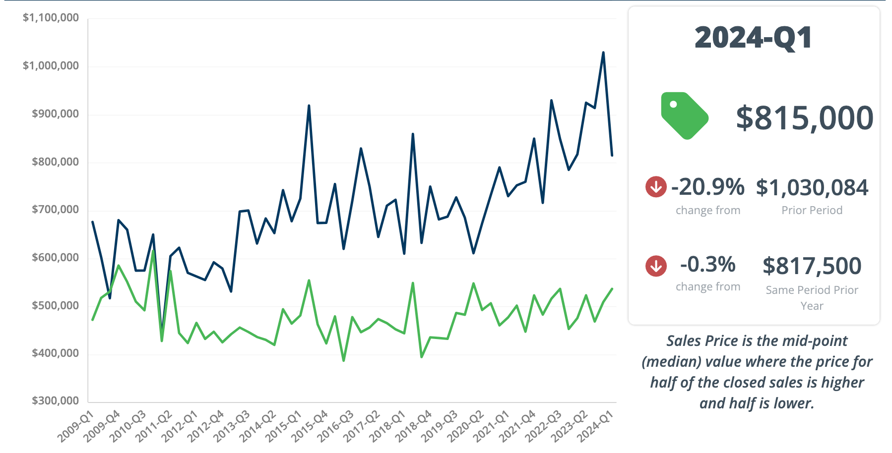 The median sale price for a condo/co-op decreased to $815,000 from the median sales price in Q1 2023, which was $817,500.