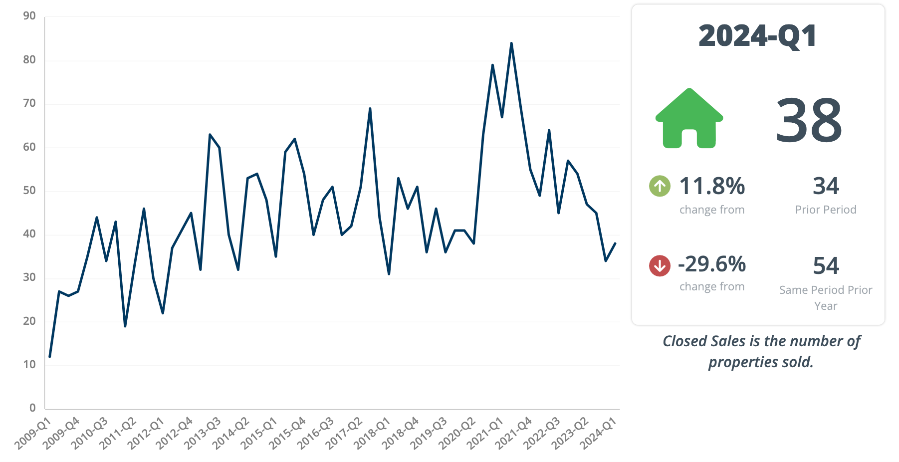 There were 38 condo/co-op residential closings reported during this time period; which was a decrease from Q1 2023 when there were 54 closings.