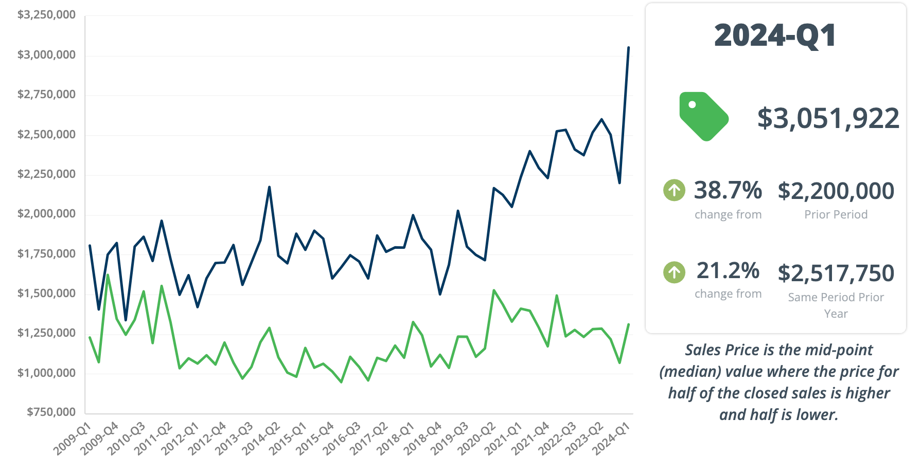 The median sale price for a single-family home increased to $3,051,922 from the median sales price in Q1 2023, which was $2,517,750.