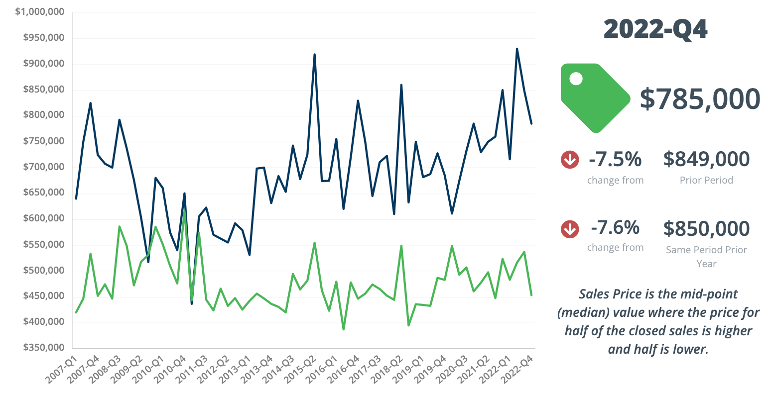 The median sale price for a condo/co-op decreased to $785,000 from the median sales price in Q4 2021, which was $850,000.