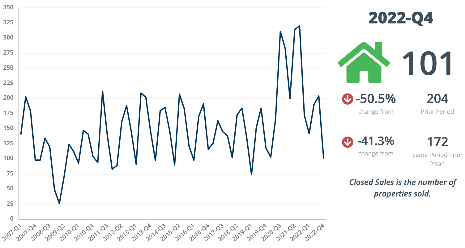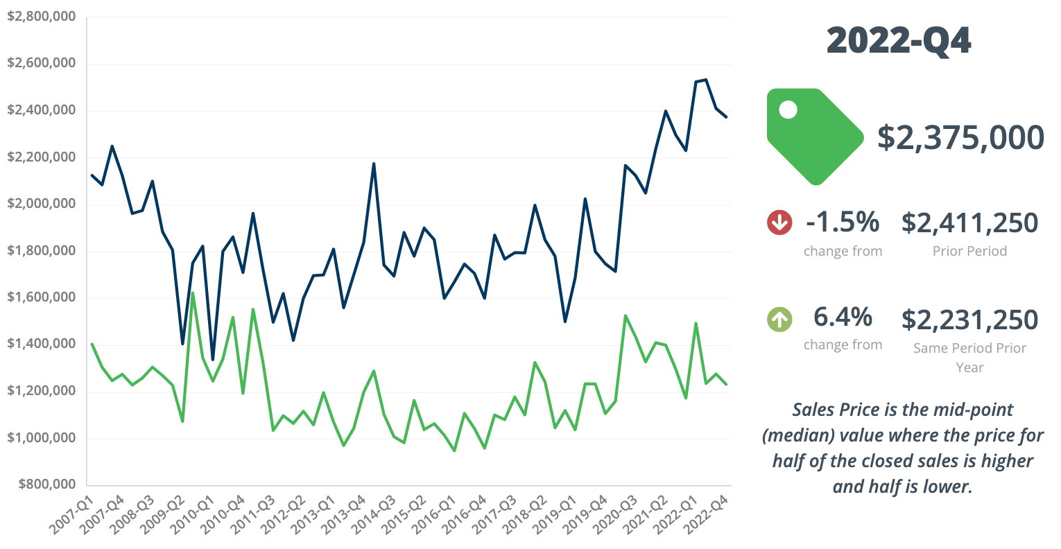 The number of single-family residential closings decreased compared to Q4 2021 when there were 172 closings. The median sale price for a single-family home increased to $2,375,000 from the median sales price in Q4 2021, which was $2,231,250.