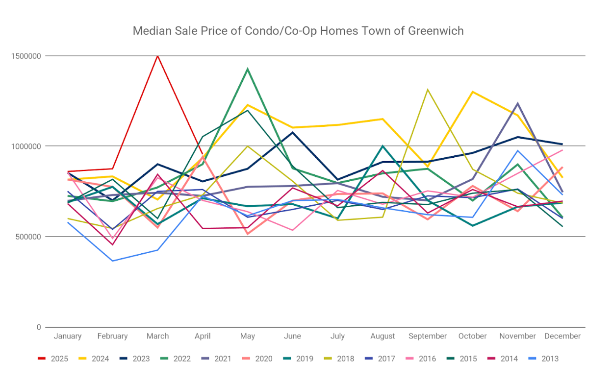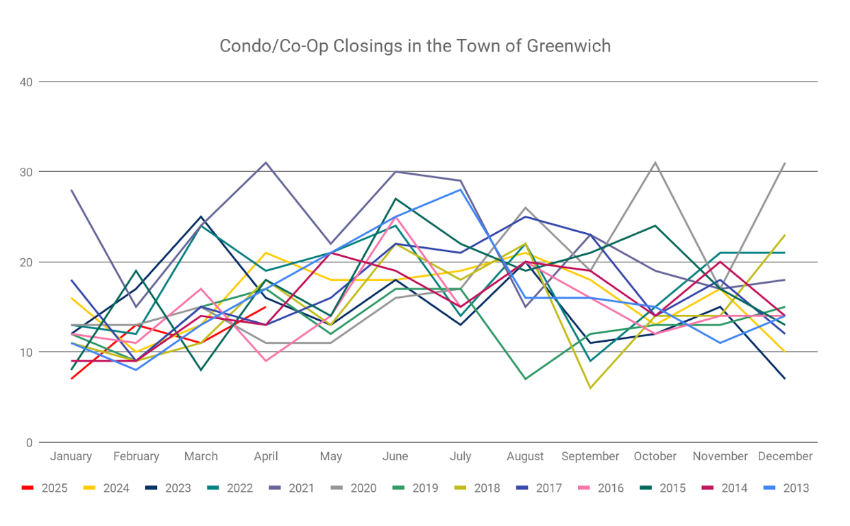 There were 15 condo/co-op residential closings reported across all areas of Greenwich during the month of April 2025. This was a decrease, compared to April 2024 when there were 21 closings.
