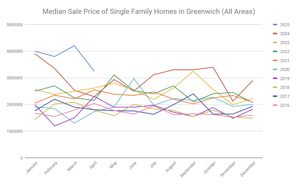 May 5, 2025 (Greenwich, CT) - The Greenwich Association of REALTORS® announces the statistics for home sales for the month of April 2025 according to figures provided by the Greenwich Multiple Listing Service, Inc. The Greenwich MLS and greenwich.realestate is the most accurate and comprehensive resource of active inventory and property listing data across all five zip codes of the Town of Greenwich.