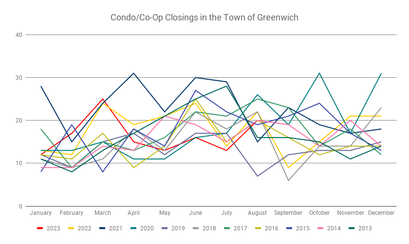There were 20 condo/co-op residential closings reported across all areas of Greenwich during the month of August 2023. This figure decreased 9% as compared to August 2022 when there were 22 closings.