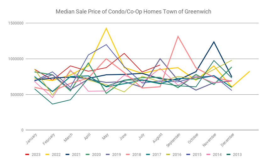 The Median Sale Price for a condo/co-op increased 7.4% to $912,500 from the median sales price in August 2022, which was $849,500.