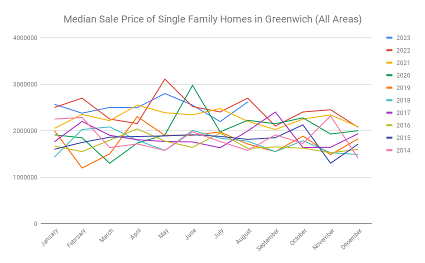 There were 64 single-family residential closings reported across all areas of Greenwich during the month of August 2023. This figure decreased 13.5% as compared to August 2022 when there were 74 closings.