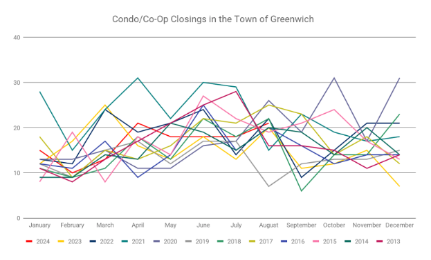 There were 21 condo/co-op residential closings reported across all areas of Greenwich during the month of August 2024. This was an increase, compared to August 2023 when there were 21 closings.