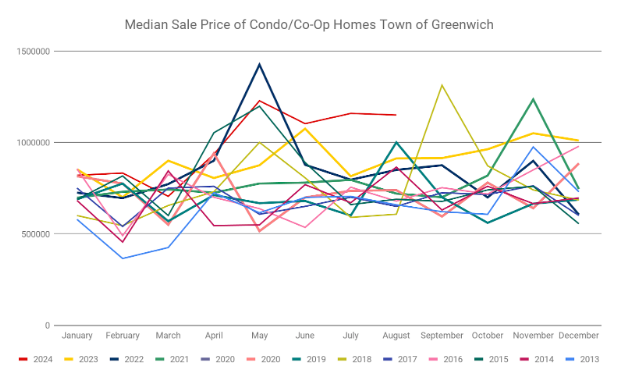 The Median Sale Price for a condo/co-op increased 26.03% to $1,150,000 from the median sales price in August 2023, which was $912,500.