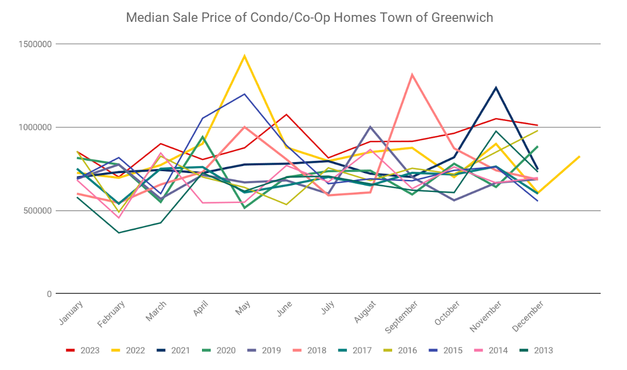 The Median Sale Price for a condo/co-op increased 66.9% to $1,010,168 from the median sales price in December 2022, which was $605,000.