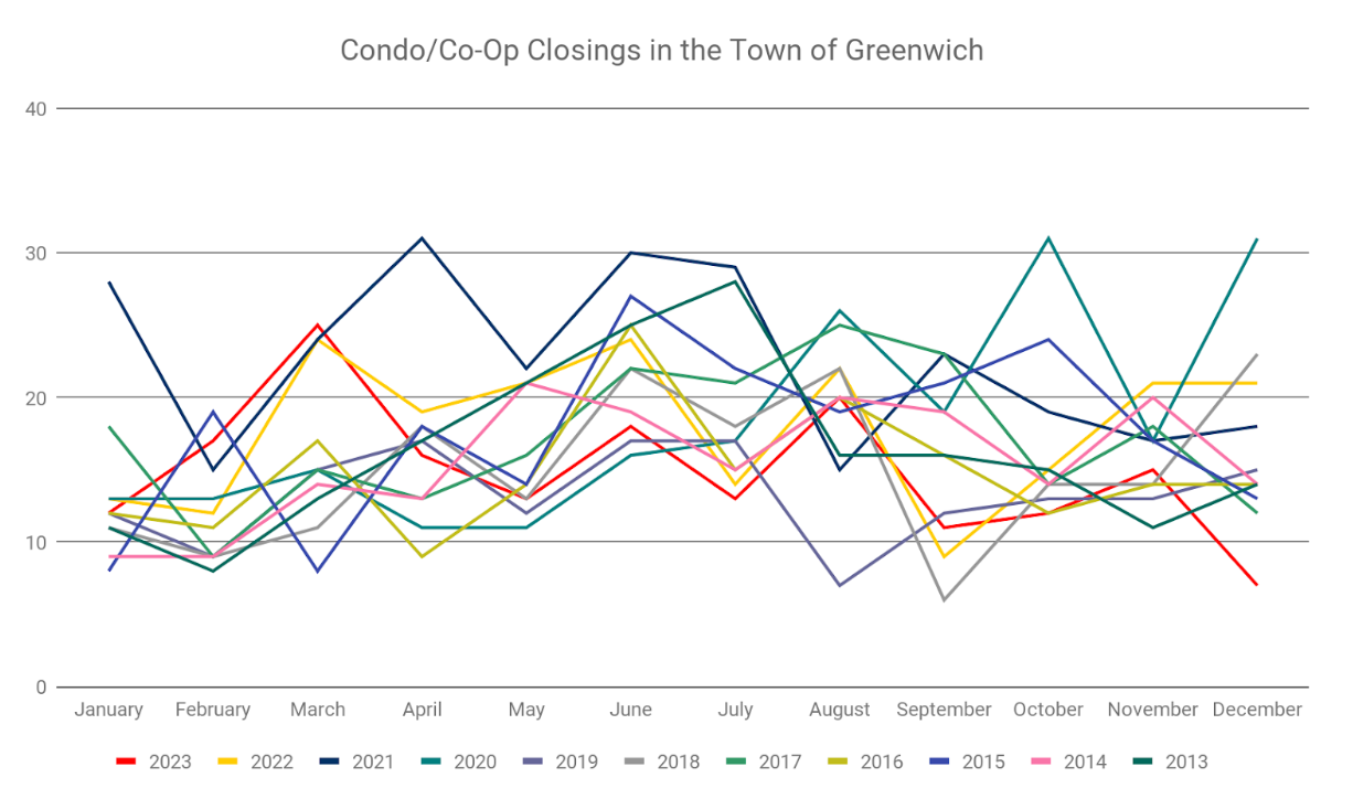 There were 7 condo/co-op residential closings reported across all areas of Greenwich during the month of December 2023. This figure decreased 66% as compared to December 2022 when there were 21 closings.