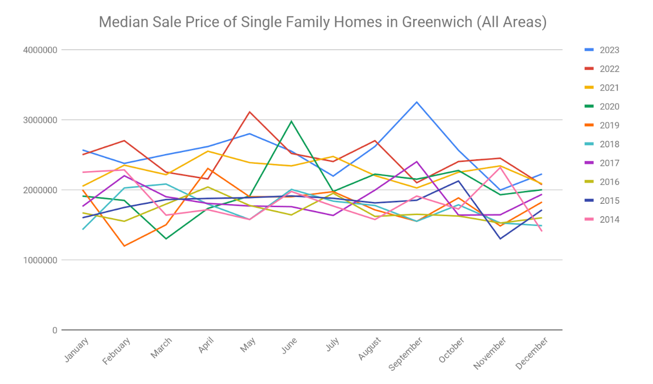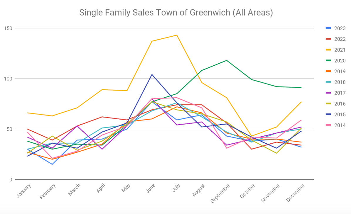 There were 32 single-family residential closings reported across all areas of Greenwich during the month of December 2023. This figure decreased 5.88% as compared to December 2022 when there were 34 closings.