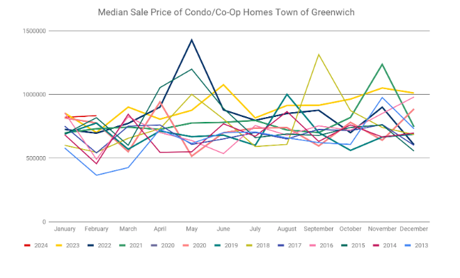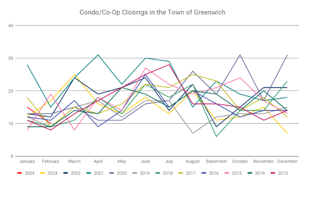 There were 10 condo/co-op residential closings reported across all areas of Greenwich during the month of February 2024. This figure decreased 41% as compared to February 2023 when there were 14 closings.
