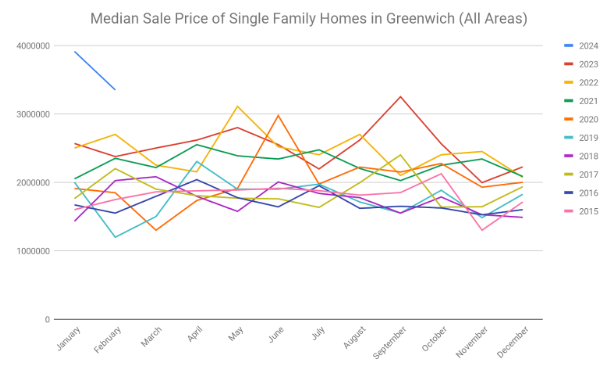 There were 17 single-family residential closings reported across all areas of Greenwich during the month of February 2024. This figure increased 13.3% as compared to February 2023 when there were 15 closings.