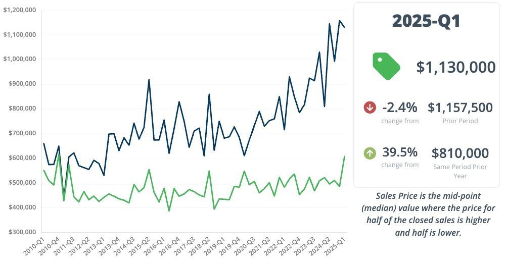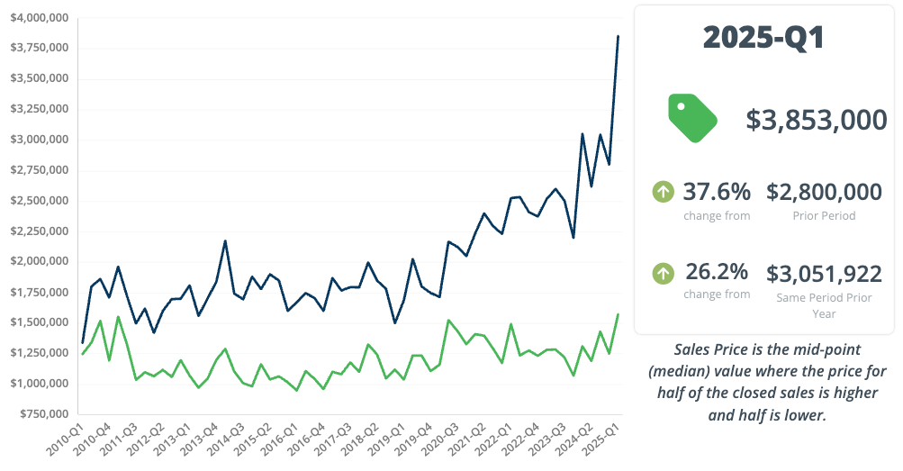 The median sale price for a single-family home increased to $3,853,000 from the median sales price in Q1 2024, which was $3,051,922.