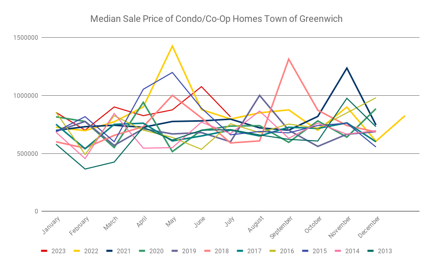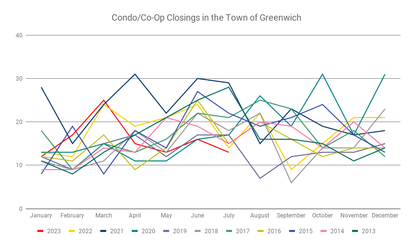 There were 13 condo/co-op residential closings reported across all areas of Greenwich during the month of July 2023. This figure decreased 7% as compared to July 2022 when there were 14 closings.