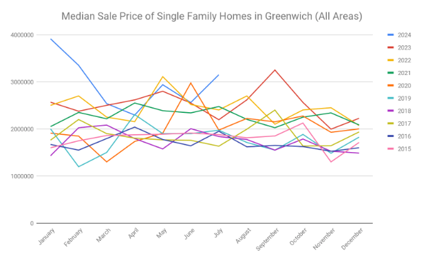 "In July, the Median Sales Price for both Single Family homes, as well as Condo/Co-op’s have seen an increase. The Median Sales Price for Single Family homes in July was $3,150,000, a 43.51% increase compared to July 2023, which was $2,195,000. The Median Sales Price for Condo/Co-op’s in July was $1,158,500, a 42.15% increase compared to July 2023, which was $815,000" stated Bryan Tunney, 2024 President of the Greenwich Association of REALTORS®.
