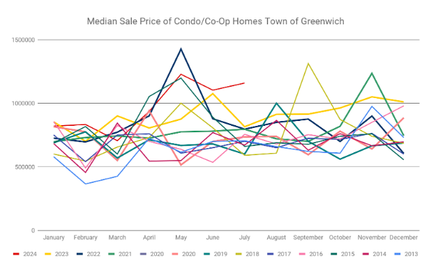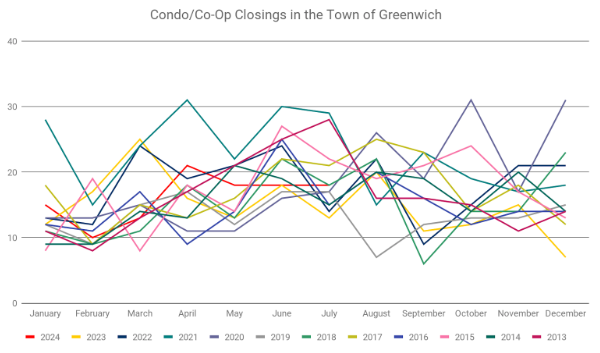 There were 18 condo/co-op residential closings reported across all areas of Greenwich during the month of July 2024. This was an increase, compared to July 2023 when there were 13 closings.