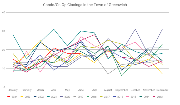 There were 18 condo/co-op residential closings reported across all areas of Greenwich during the month of June 2024. This figure remained the same as compared to June 2023 when there were 18 closings.