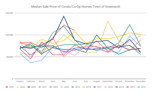 The Median Sale Price for a condo/co-op increased 2.55% to $1,102,440 from the median sales price in June 2023, which was $1,075,000.