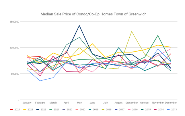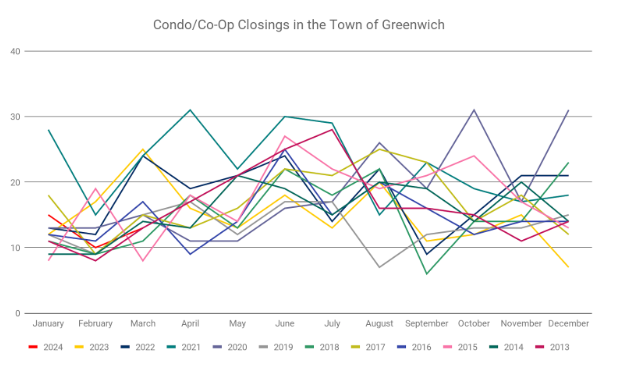 There were 13 condo/co-op residential closings reported across all areas of Greenwich during the month of March 2024. This figure decreased 48% as compared to March 2023 when there were 25 closings.