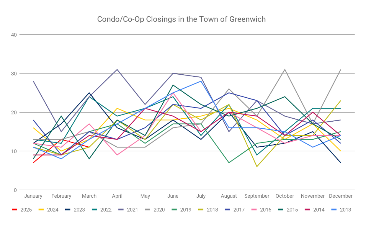 There were 11 condo/co-op residential closings reported across all areas of Greenwich during the month of March 2025. This was a decrease, compared to March 2024 when there were 13 closings.