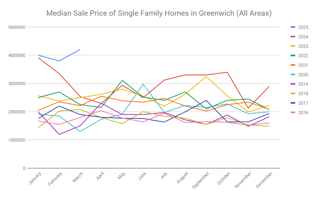 April 4, 2025 (Greenwich, CT) - The Greenwich Association of REALTORS® announces the statistics for home sales for the month of March 2025 according to figures provided by the Greenwich Multiple Listing Service, Inc. The Greenwich MLS and greenwich.realestate is the most accurate and comprehensive resource of active inventory and property listing data across all five zip codes of the Town of Greenwich.