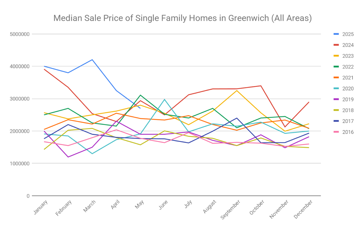 June 5, 2025 (Greenwich, CT) - The Greenwich Association of REALTORS® announces the statistics for home sales for the month of May 2025 according to figures provided by the Greenwich Multiple Listing Service, Inc. The Greenwich MLS and greenwich.realestate is the most accurate and comprehensive resource of active inventory and property listing data across all five zip codes of the Town of Greenwich.