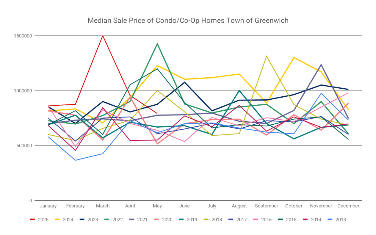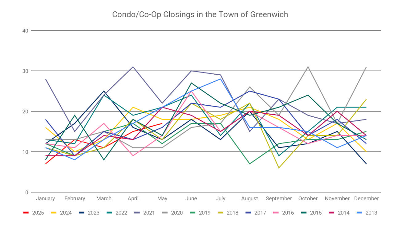 There were 17 condo/co-op residential closings reported across all areas of Greenwich during the month of May 2025. This was a decrease, compared to May 2024 when there were 18 closings.