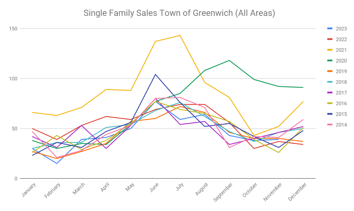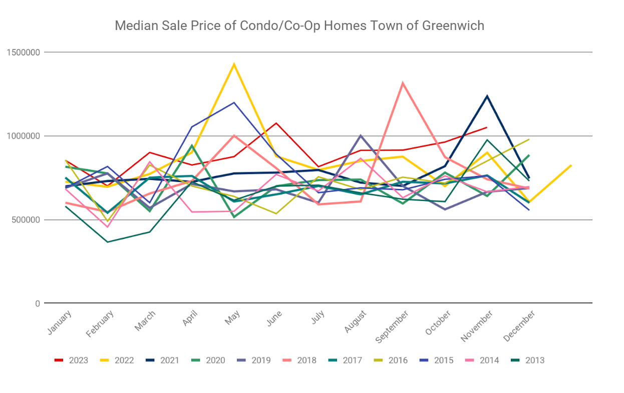 "In terms of sales, single family homes in the Town of Greenwich saw a 9% increase throughout November 2023, ending the month at 24 closings, as compared to both the month and year prior with 22 closings. Condo/Co-op median sales saw an increase of 16%, finishing the month at $1,050,000, as compared to both the month and year prior with a median sales price of $899,000” stated Bryan Tunney, 2023 President of the Greenwich Association of REALTORS®