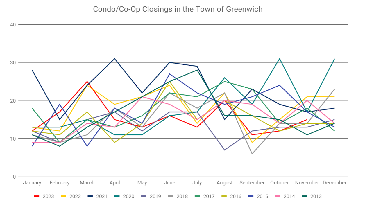 There were 15 condo/co-op residential closings reported across all areas of Greenwich during the month of November 2023. This figure decreased 21% as compared to November 2022 when there were 21 closings.