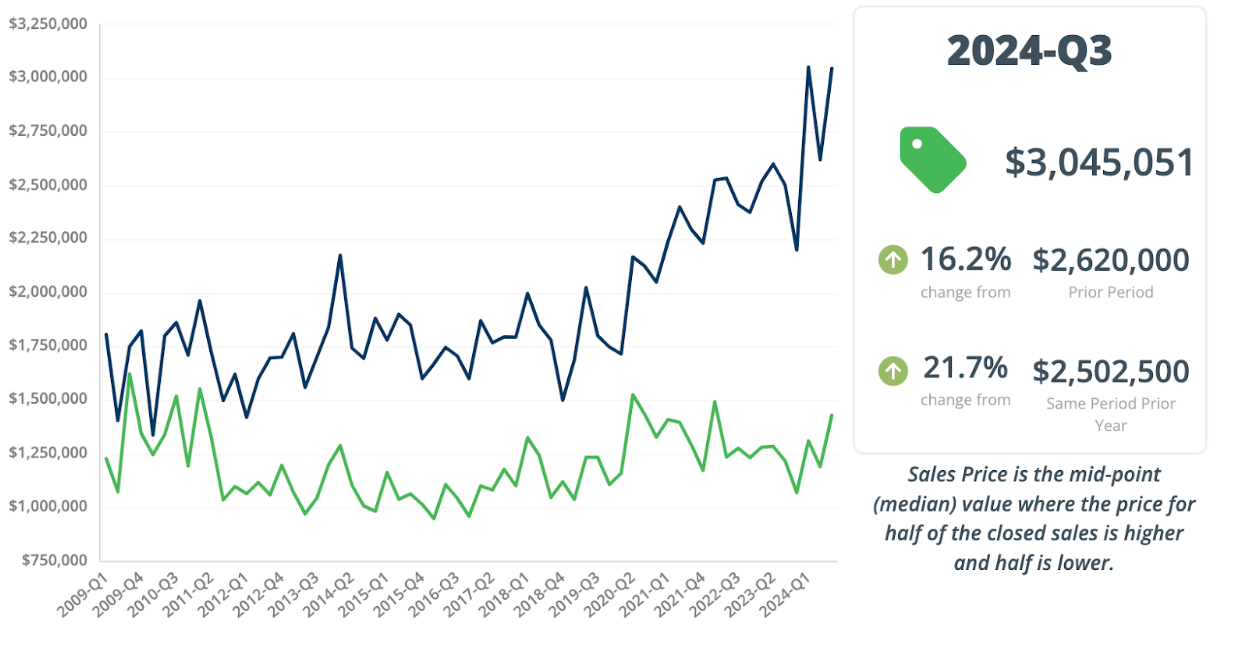 The median sale price for a single-family home increased to $3,045,051 from the median sales price in Q3 2023, which was $2,502,500.