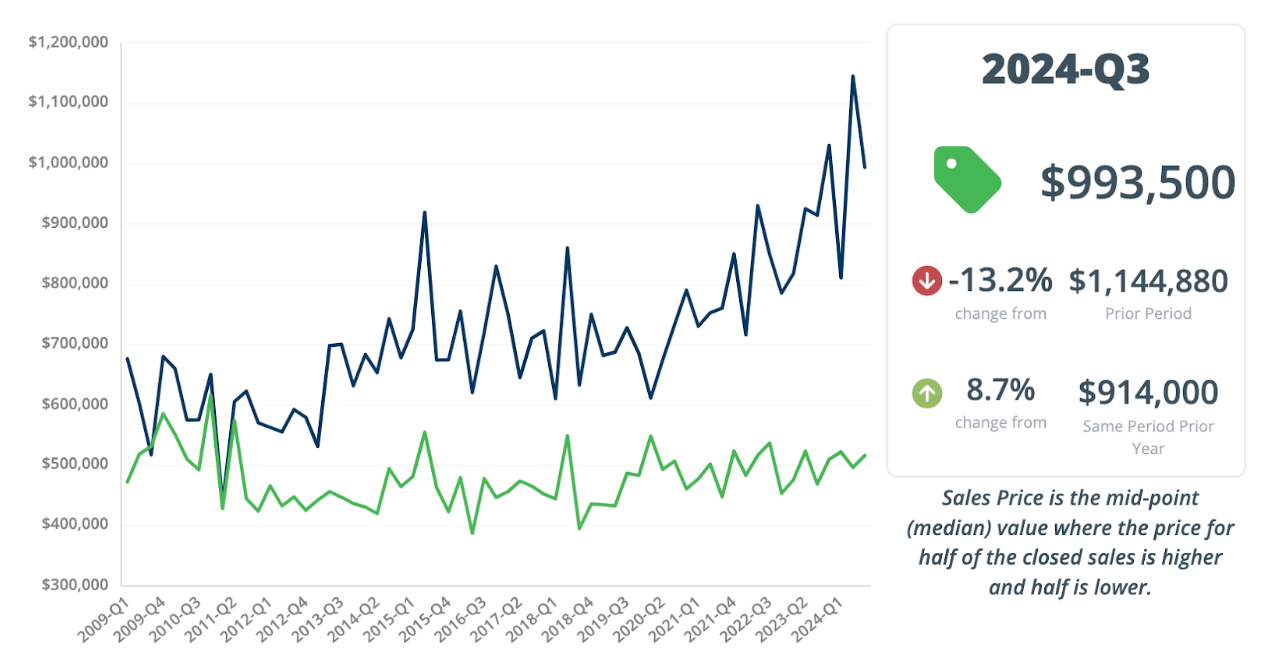 The median sale price for a condo/co-op increased to $993,500 from the median sales price in Q3 2023, which was $914,000.